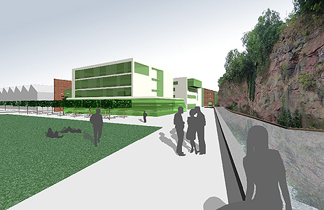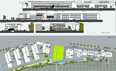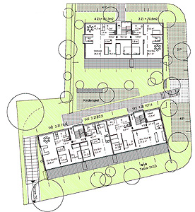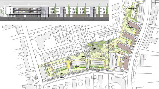 Das Planungskonzept zeigt eine klare Baustruktur, die sich am Verlauf der Sudetenstraße orientiert und mit einer nach Süden ausgerichteten Bebauung angenehm gestaltete Höfe bildet. Über ein Gemeinschaftshaus und mehrere Spielflächen wird ein gut nutzbarer Aufenthaltsbereich geschaffen. Die optimal nach Süden orientierten Wohnungen werden durch einen schmalen Lärmschutzbaukörper hervorragend abgeschirmt. Im EG sind die notwendigen Nebenräume sinnvoll untergebracht; die in den Obergeschossen liegenden kleinen 2-Zimmer-Wohnungen sind gut an den Erschließungskern angebunden, an den auch die Laubengänge anschließen.