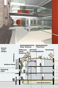 Die Gebäude werden in konventioneller Bauweise unter Berücksichtigung einer ökologischen Materialauswahl errichtet - massive Wärmedämmziegel oder alternativ Verbundsteine aus Kalksand und Mineralschaum (Twinstone). Einfache Baukörper und die Reduzierung auf jeweils eine Erschließung (Aufzug) pro Wohngruppe dienen der Wirtschaftlichkeit.