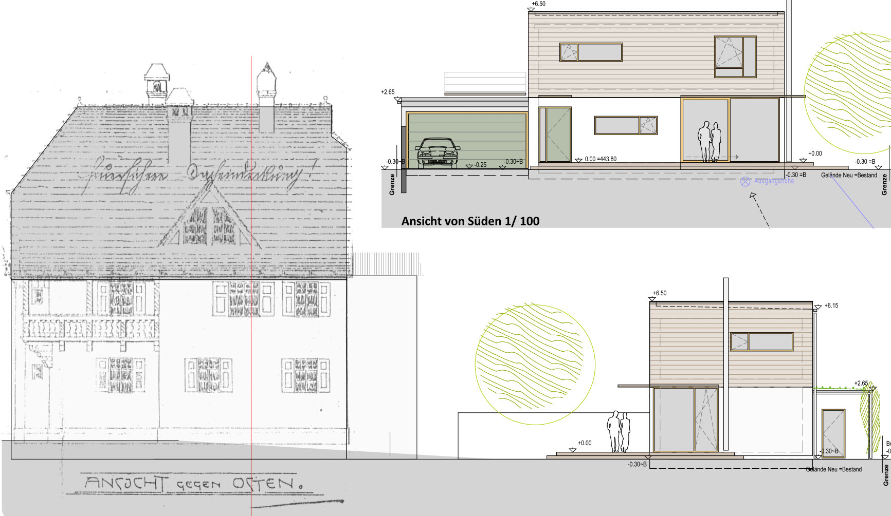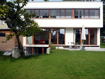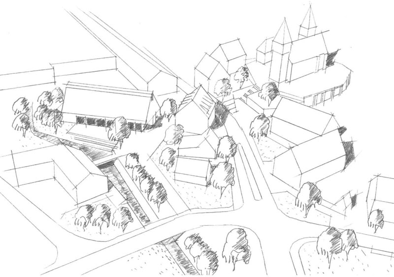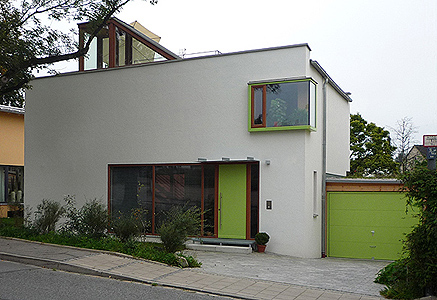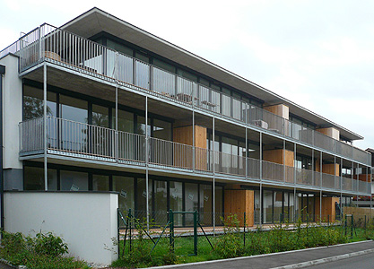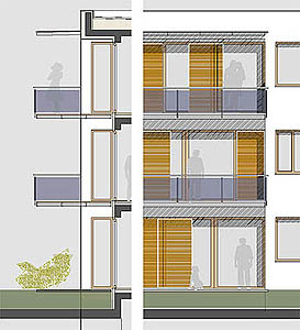 Die neue Bebauung reagiert auf die Verkehrsbelastung der Sudetenstraße mit der vorgefundenen Typologie der Straßenrandbebauung. Die Wohnungen in der geschlossenen als Schallschutz wirksamen Bebauung sind nach Westen orientiert.